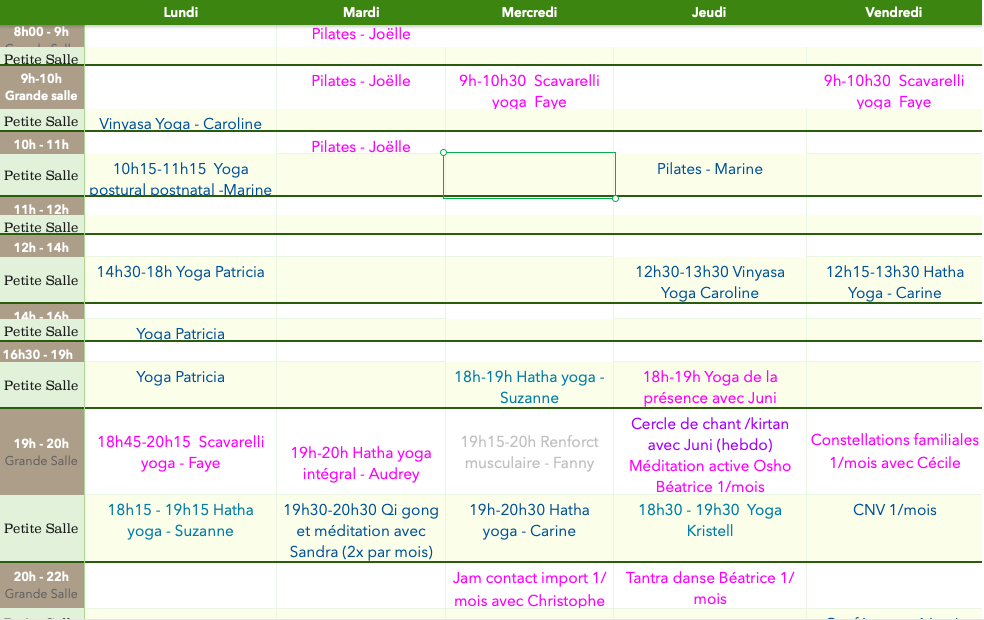 et 10h30-12h30, en douceur, une fois par mois avec Juni (cacao, kirtan, danse)