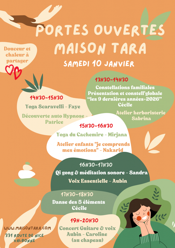 Bienvenue à toutes et à tous. A la joie de vous accueillir à Maison TARA et de partager ces ateliers et spectacles avec vous ! Il n’est pas nécessaire de vous inscrire ! Venez simplement, en toute légèreté, nous rejoindre. NB. Pas de parking possible dans la cours de la maison. Vous pouvez vous garer dans les parkings gratuits du village. Vous trouverez un plan avec le cheminement pour nous rejoindre ici.